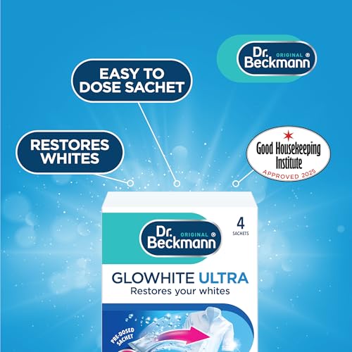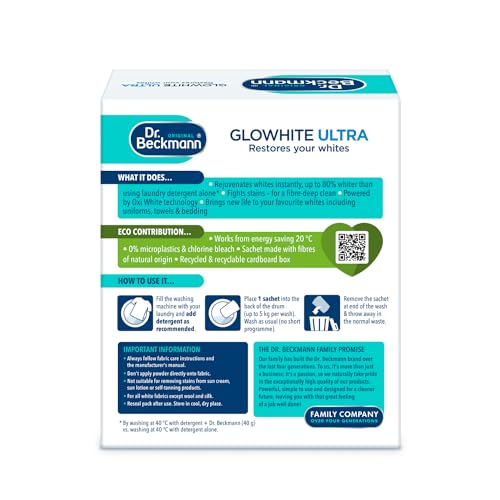 Dr. Beckmann Glowhite ultra prevents your white clothes from greying and yellowing and maintains the brilliance of your whites, while being gentle on fabrics. Ideal to be used with every white wash to maintain bright whites.Effective on all fabrics (except below) and cool temperature wash cycles. Free from chlorine bleach. Not suitable for:-Stain removal of suntan lotion and self-tan-New wool and silkDIRECTIONS FOR USE- Simply pop a sachet into the back of the machine drum on top of the laundry, then add your USUAL washing detergent as normal- As the unique combination of whitening agents work on a veriety of fabrics and temperatures, you can turn the dial as low as 20° C or as high as 95° C – Wash as normal, always remember to remove the empty sachet at the end of the wash and dispose. IMPORTANT INFORMATION- Always check the wash care label and machine instructions before you wash- wash matching pieces together-Always remove empty sachet at the end of the wash cycle-Suitable for washable, colourfast items