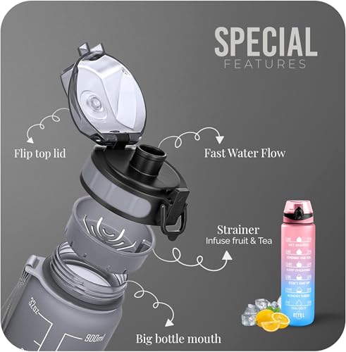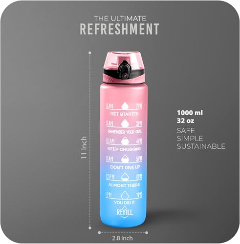 WATER BOTTLE HYDRATION ON-THE-GO : Stay refreshed with a lightweight & handy sports water bottle 1L; Time marked water bottle is featuring an effortless sipping during your activities