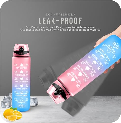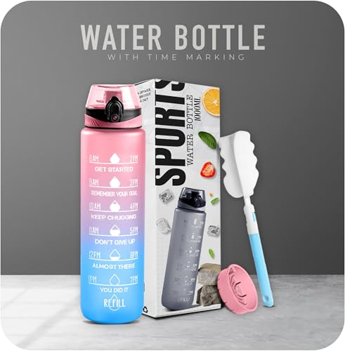 K-MART Water Bottle 1L, Sports Water Bottle with Time Markings, BPA-Free, Leak-Proof Drinks Bottle, Perfect for Running, Cycling, Gym, Yoga, Camping and Outdoor Activities, Pink & Blue