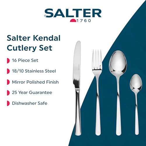 Salter Kendal Cutlery Set – 16 Piece, 18/10 Stainless Steel Dinnerware, 4 Place Settings, Mirror Polished Finish, Including Forks, Knives, Teaspoons, Tablespoons, Dishwasher Safe, 50 Year Guarantee